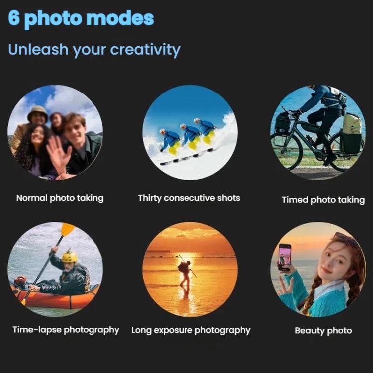 12. Photo mode: 6 photo modes (normal photo, 30 continuous shots, timer, time delay, long exposure, beauty photo)