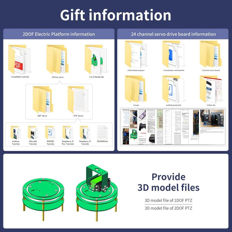 4. Multiple mounting holes provided: The two-dimensional electric pan-tilt bracket offers multiple M3 mounting holes. The top supports the installation of various sensors, cameras, and other electronic devices; the middle layer can support the installation of various sensors, cameras, and other electronic devices when the upper layer servo is not installed. The bottom has four M3 fixed copper columns that allow the pan-tilt to be installed on robots, carts, or desks as a whole.
