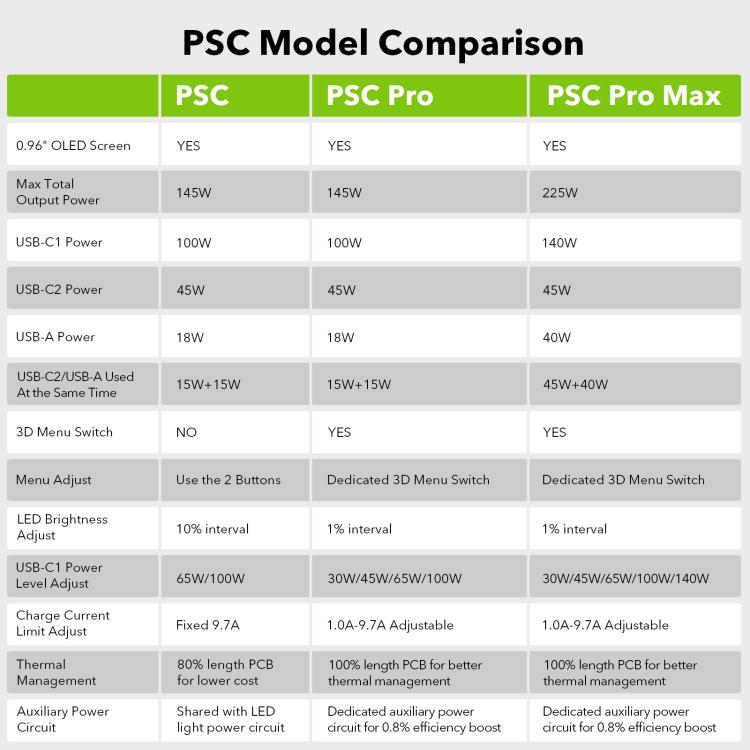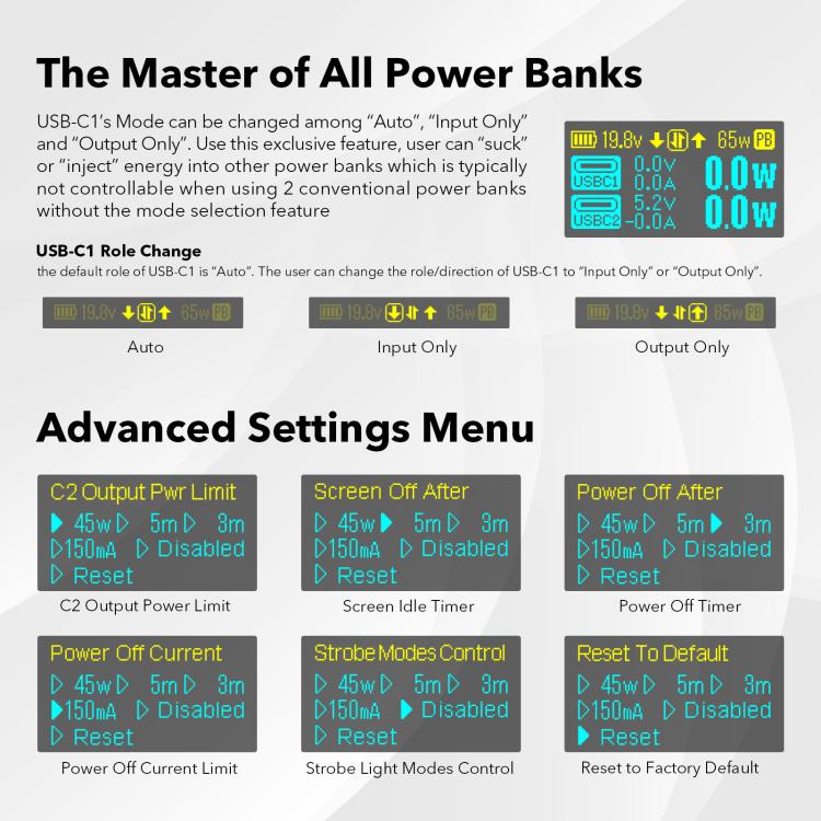 6. Energy flow control system (exclusive to USB-C1): USB-C1 supports mode switching (auto/only input/only output), breaking the traditional power banks unidirectional transmission limitation and achieving active energy management.
