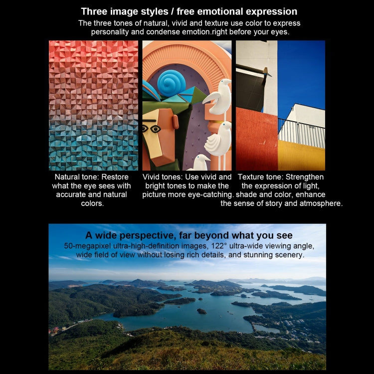 3. وظائف الكاميرا: الكاميرا الخلفية: التقاط عين النسر، وضع الفيلم، فيديو متعدد العدسات، التصوير بالذكاء الاصطناعي، وضع البكسل العالي، التصوير الفوتوغرافي الفاصل الزمني، زاوية واسعة، فتحة كبيرة، وضع المشهد الليلي، سوبر ماكرو، وضع الصورة (بما في ذلك تجميل الجلد)، الوضع الاحترافي، الحركة البطيئة، بانوراما، مرشح، علامة مائية، التقاط الابتسامة، صورة يتم تنشيطها صوتيًا، التصوير المؤقت، مسح المستندات، فيلم صغير؛ الكاميرا الأمامية: وضع الصورة، مرشح، التقاط الابتسامة، مرآة سيلفي، صورة يتم تنشيطها صوتيًا، التصوير المؤقت، صورة الإيماءة، وضع المشهد الليلي، وضع العلامة المائية، وضع البكسل العالي، تسجيل متعدد العدسات