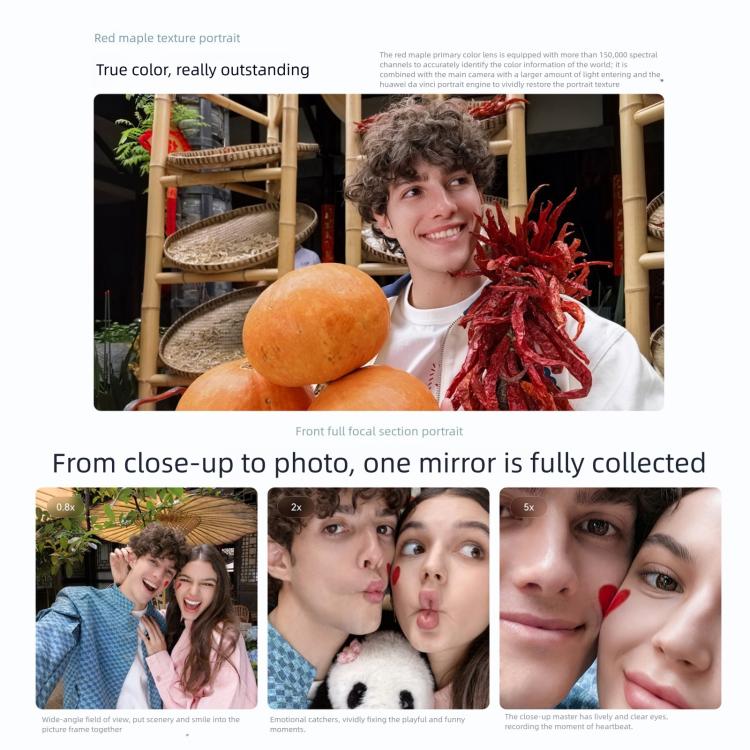 1. الكاميرا الخلفية: عدسة RYYB متغيرة الفتحة مضادة للاهتزاز بدقة 50 ميجابكسل (F1.4~F4.0) + عدسة مقربة RYYB بدقة 12 ميجابكسل (F2.4) + عدسة ماكرو فائقة الاتساع بدقة 8 ميجابكسل (F2.2) + عدسة أساسية متعددة الأطياف بدقة 1.5 ميجابكسل من خشب القيقب الأحمر (F2.4)