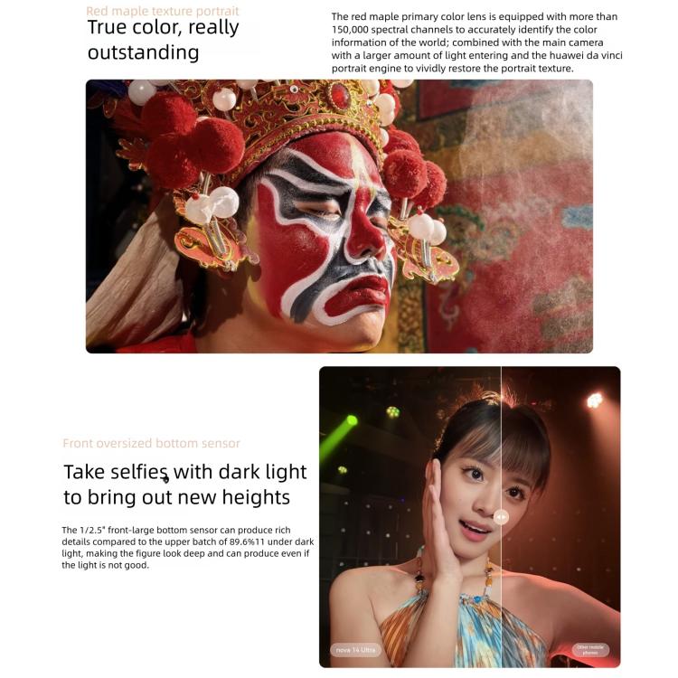 1. الكاميرا الخلفية: عدسة RYYB متغيرة الفتحة بدقة 50 ميجابكسل (F1.4~F4.0، OIS) + عدسة مقربة RYYB بدقة 50 ميجابكسل (F2.2، OIS) + عدسة ماكرو RYYB فائقة الاتساع بدقة 13 ميجابكسل (F2.2) + عدسة أساسية متعددة الأطياف بدقة 1.5 ميجابكسل من خشب القيقب الأحمر (F2.4)
