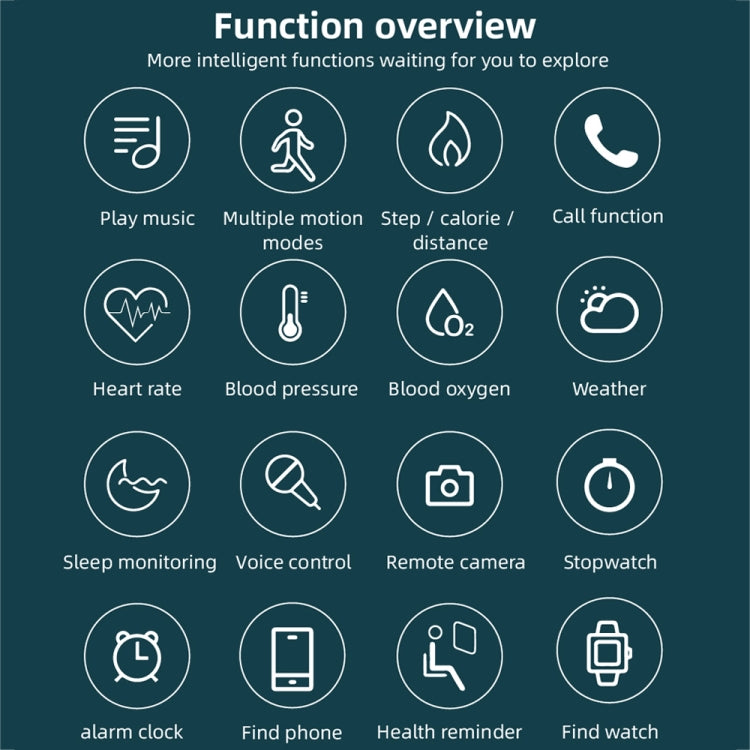 1. Support APP synchronization, answering calls, touch to reject calls, touch to start voice assistant, information push, heart rate, blood pressure, blood oxygen, multi-sport mode, continuous heart rate, search mobile phone, message reminder, message storage, time synchronization, Music playback, remote control camera, drinking water monitoring, sedentary monitoring, sleep monitoring, pedometer, search bracelet, alarm clock setting, stopwatch, screen brightness setting, dial setting, raise hand to brighten the screen, earphone prompt sound
