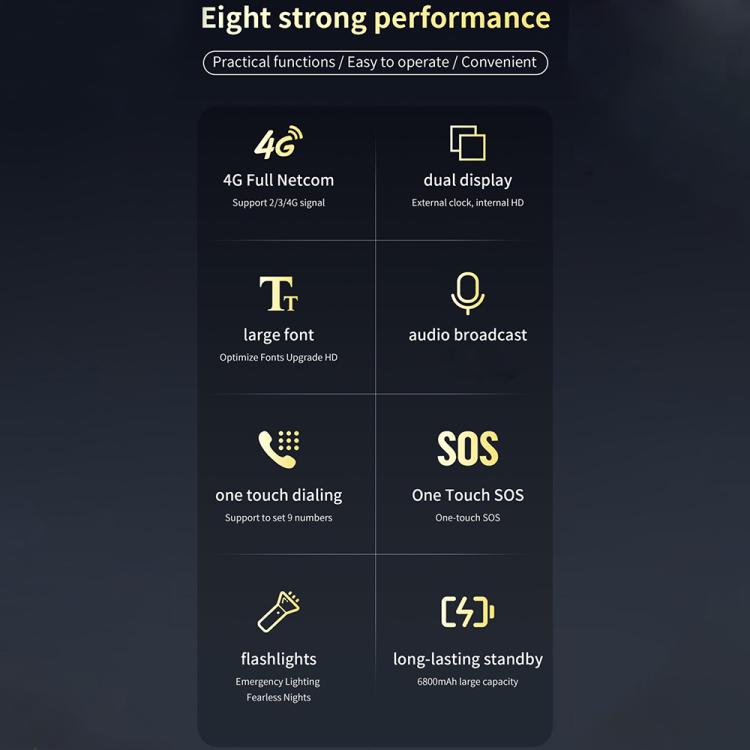 ١٥. الوظائف: كاميرا، تسجيل فيديو، تشغيل موسيقى، تسجيل صوتي، راديو FM، بلوتوث، منبه، آلة حاسبة، تقويم، دعم SOS لخمس مجموعات، اتصال عائلي/اتصال سريع: ٩ مجموعات، برامج تواصل اجتماعي: متصفح، فيسبوك، واتساب؛ تصميم ثلاثي الأبعاد، شاشتان كبيرتان (٢.٨ بوصة + ٢.٤ بوصة)، أزرار كبيرة، أزرار اختصار، زر جانبي لتشغيل مصباح يدوي بلمسة واحدة، مكبر صوت كبير بصوت عالٍ، بطارية كبيرة، وضع استعداد طويل، سماعة أذن عالية الصوت، اهتزاز، مصباح يدوي، خط كبير؛ يحفظ ١٠٠ رقم هاتف محمول و٢٠٠ رسالة نصية. اضغط مطولاً على مفتاح ٠ لإجراء مكالمة طوارئ SOS، اضغط مطولاً على مفتاح # للتبديل بين أوضاع الاهتزاز والموسيقى والصامت.
