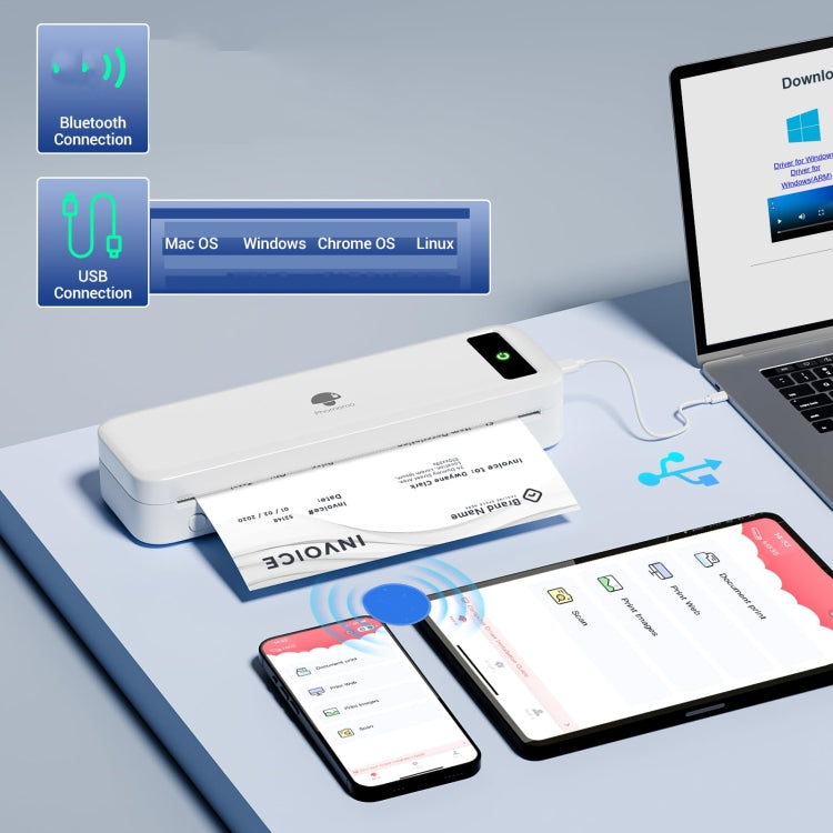 5. High compatibility: This portable thermal printer is compatible with a wide range of devices, including Android and iOS smartphones, tablets, Windows 10/11, Linux and macOS laptops. Simply connect it to your device via Bluetooth for smartphones or USB for PCs, and start printing. Its that simple and fast! (Note: PC devices are only suitable for USB connection and require driver installation.)