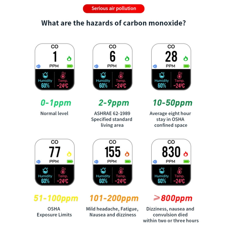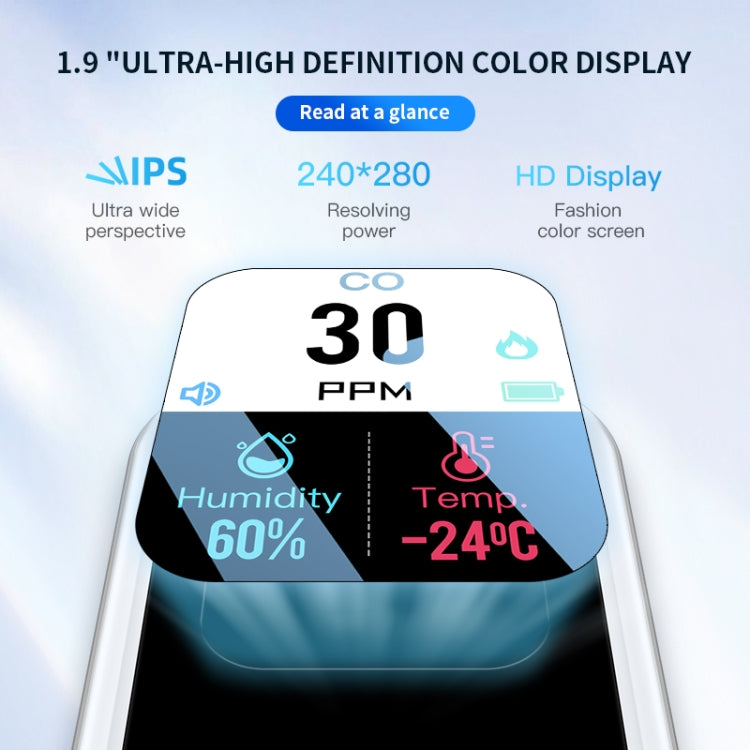 8. 1.9-inch high-definition color screen, equipped with high-precision sensors, real-time monitoring of CO gas concentration is more accurate, and reading is more intuitive and convenient