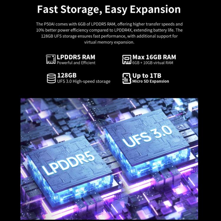 6. مع ما يصل إلى 16 جيجابايت من ذاكرة الوصول العشوائي (6 جيجابايت LPDDR5 بالإضافة إلى 10 جيجابايت افتراضية) ومساحة تخزين UFS3.0 بسعة 128 جيجابايت، يوفر P50AI وصولاً سريعًا للبيانات ومساحة واسعة، مما يضمن تعدد المهام بسلاسة ومساحة تخزين كبيرة للتطبيقات والوسائط.