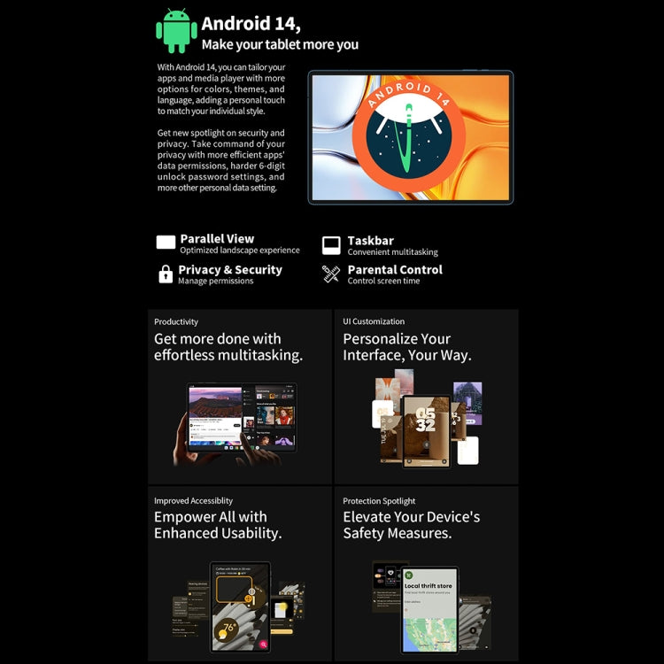 تابلت تيكلاست T70، 8 جيجابايت + 256 جيجابايت، شاشة 14 بوصة، أندرويد 14، معالج ميديا تيك هيليو G99 ثماني النواة، يدعم شريحتي اتصال، T70