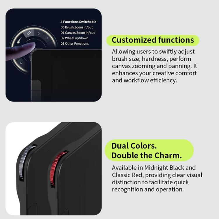 2. Rotating aluminum dial, easy to use, improves work efficiency, can be customized, quickly adjusts brush size, hardness, flow, opacity, and can also perform other functions such as zooming in and out and dragging images
