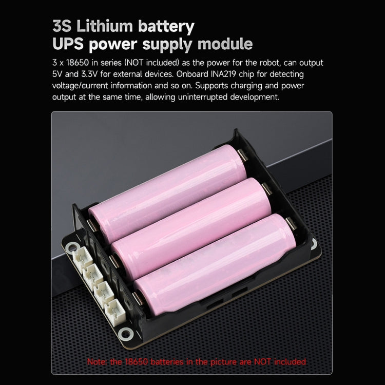 4. Built-in 3S UPS power module, supports 3 18650 lithium batteries (series connection, not included), provides uninterrupted power supply for the robot, and supports charging and power output at the same time.