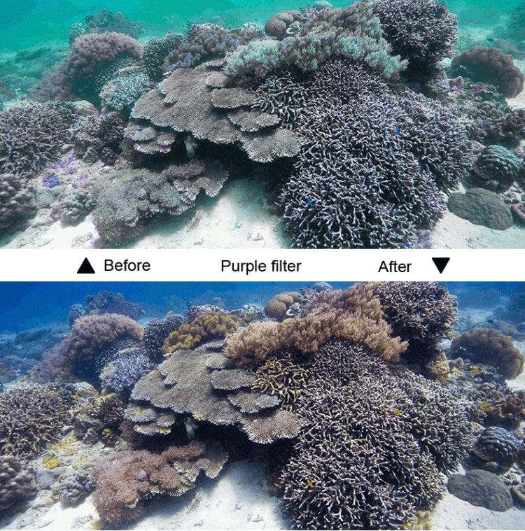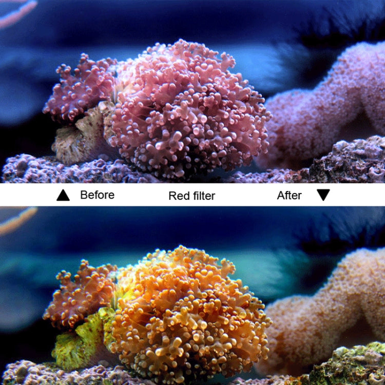 6. With 3 color filters: Purple filter helps color correction in freshwater lakes and reservoirs that appears green. Red filter for professional color correction under blue and tropical water, absorbed red color at depth of 5-25m, prevent taking pictures too blue or too green. Pink is designed to correct light blue or shallow water.