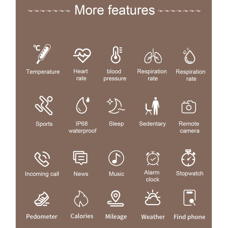 11. Function: female health (menstrual cycle), body temperature monitoring and warning, full circle full touch screen, dynamic UI, blood oxygen monitoring, breathing rate, blood pressure monitoring, step/calorie/distance, multi-sports mode, remote care function, incoming call Reminders, information reminders, etc.