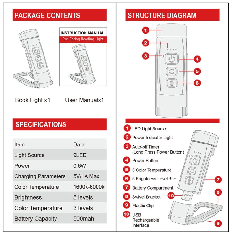 USB Charging Portable Detachable Reading Clip Light Rotatable Eye Protection Mini LED Lamp